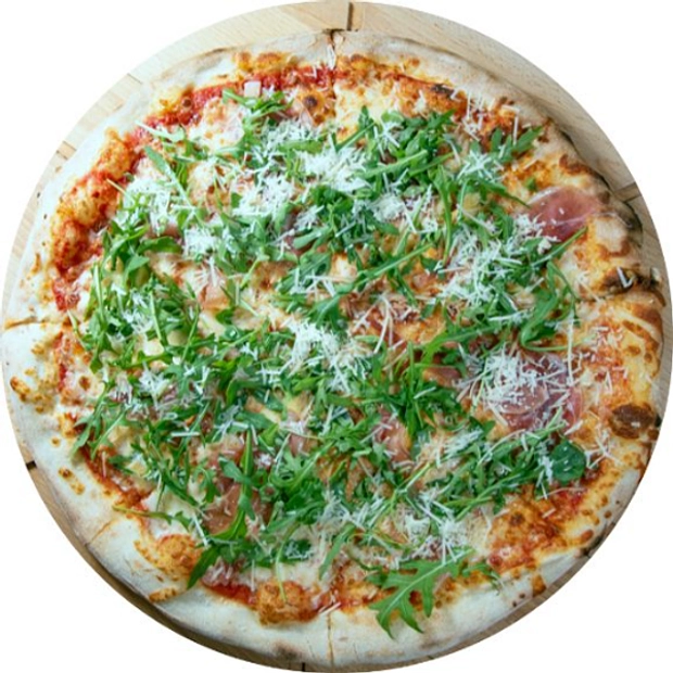sugo, mozzarella, parmská šunka, rukola, parmezán