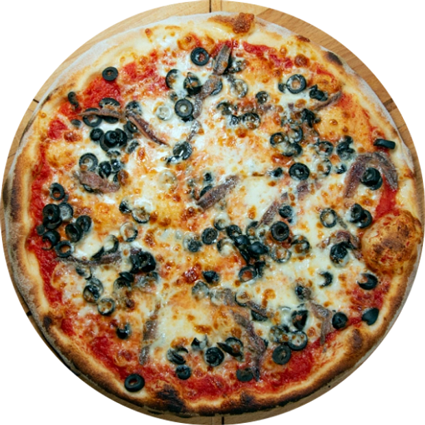 sugo, mozzarella, olivy, ančovičky